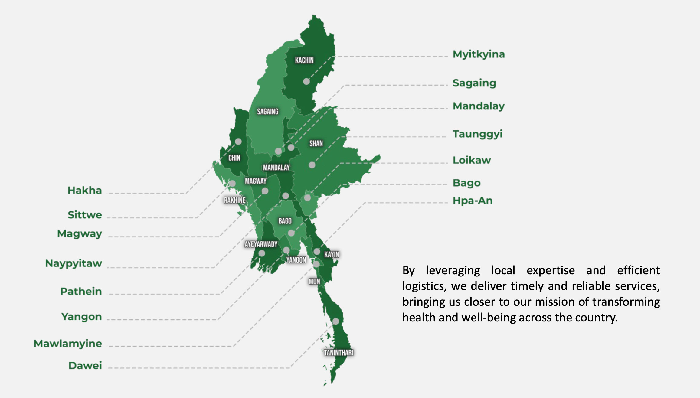 Our robust distribution network spans across 15 cities throughout Myanmar, ensuring that our innovative healthcare solutions are accessible to communities nationwide.